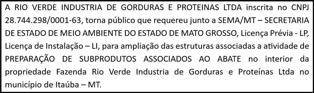 A RIO VERDE INDUSTRIA DE GORDURAS E PROTEINAS LTDA inscrita no CNPJ 28.744.298/0001-63, torna público que requereu junto a SEMA/MT – SECRETARIA DE ESTADO DE MEIO AMBIENTE DO ESTADO DE MATO GROSSO, Licença Prévia - LP, Licença de Instalação – LI, para ampliação das estruturas associadas a atividade de PREPARAÇÃO DE SUBPRODUTOS ASSOCIADOS AO ABATE no interior da propriedade Fazenda Rio Verde Industria de Gorduras e Proteínas Ltda no município de Itaúba – MT.