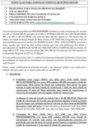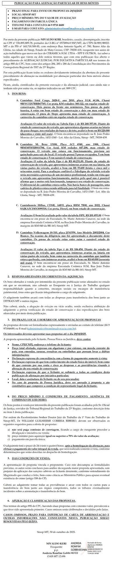 Por meio da presente publicação NIVALDO KERI, brasileiro, casado, desempregado, inscrito no CPF nº 336.895.809-78, portador da CI-RG nº 0375894-0 SSP/MT, da CTPS 04.989/00022- MT e do PIS nº 165.718.308-85, com endereço Rua Antonio Sgarbi, nº. 780, Bairro Alto da Glória, na cidade de Sinop, Estado de Mato Grosso, CEP: 78558-418, exequente nos autos de ação trabalhista que move em face de CERÂMICA H.M. LTDA – EPP E OUTROS, faz saber a todos aqueles que virem ou dele notícia tiverem, que com esta publicação fica aberto o procedimento de ALIENAÇÃO JUDICIAL POR INICIATIVA PARTICULAR nos termos do artigo 880 do CPC, bem como dos artigos 284, 285 e 286 da Consolidação dos Provimentos da Corregedoria Regional do TRT da 23ª Região.