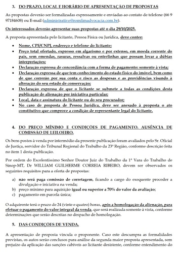 Por ordem do Excelentíssimo Senhor Doutor Juiz do Trabalho da 1ª Vara do Trabalho de Sinop-MT, Dr WILLIAM GUILHERME CORREIA RIBEIRO, devem ser observados os seguintes requisitos para a oferta de propostas: