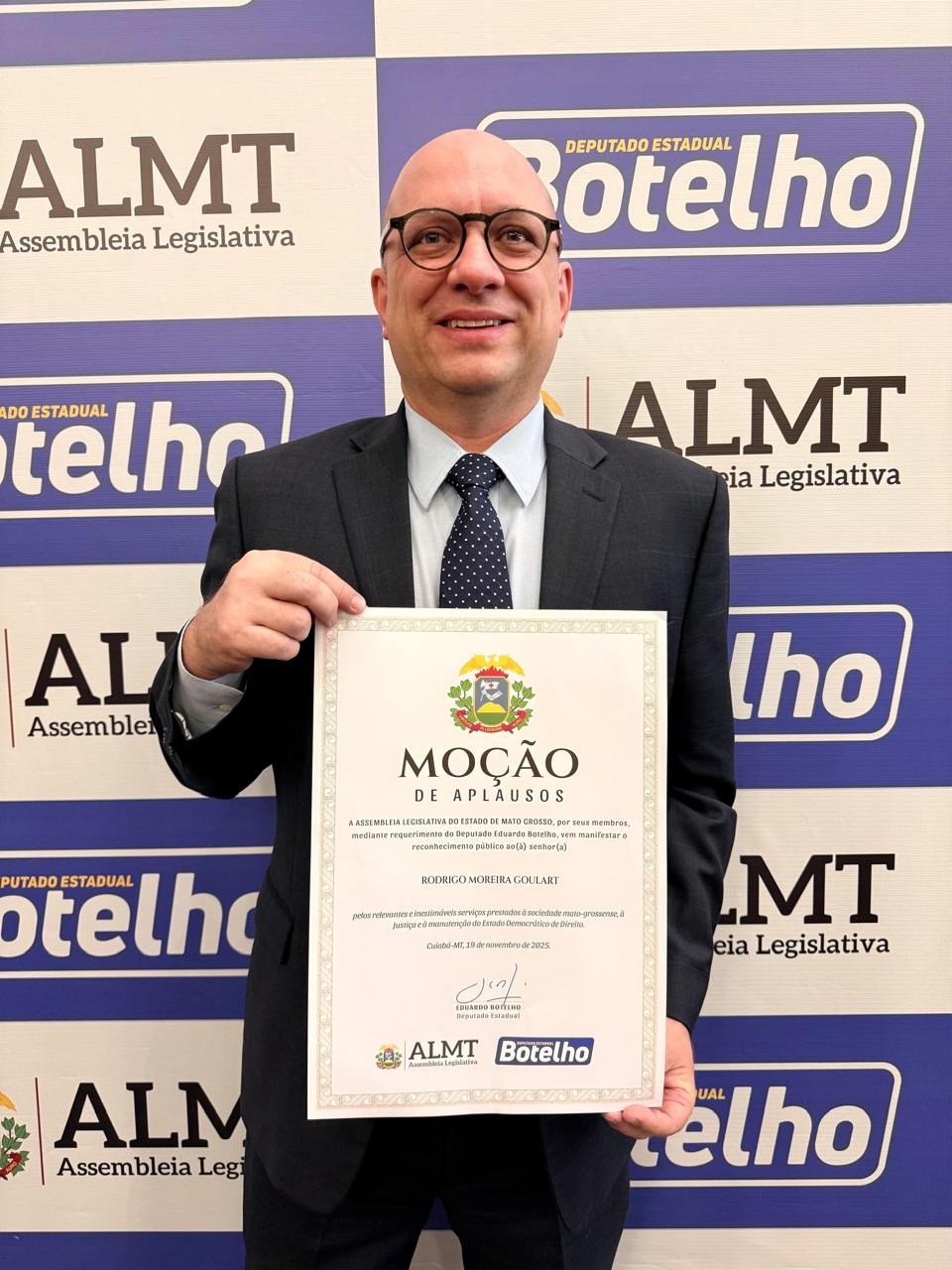 A Assembleia Legislativa de Mato Grosso conferiu uma Moção de Aplauso ao advogado residente em Sinop, Rodrigo Moreira Goulart. A homenagem foi uma das entregues na sessão solene realizada pela casa de leis nesta quarta-feira (19), em Cuiabá. O reconhecimento aos serviços “inestimáveis” e pela sua atuação em prol da justiça e da manutenção do estado democrático de Direito veio através do requerimento apresentado pelo deputado estadual, Eduardo Botelho.