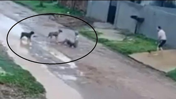 A vítima pega algumas pedras para se defender dos animais, mas é novamente atacada e cai no chão. Moradores usaram uma vassoura e um pedaço de madeira para tentar evitar que o idoso fosse novamente atacado.