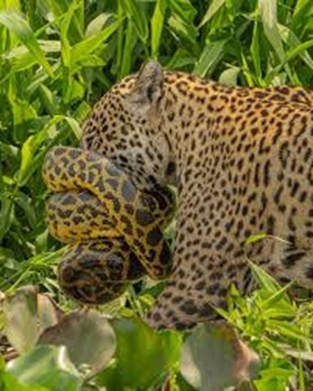 Sucuri se enrola no focinho de onça durante ataque no Pantanal