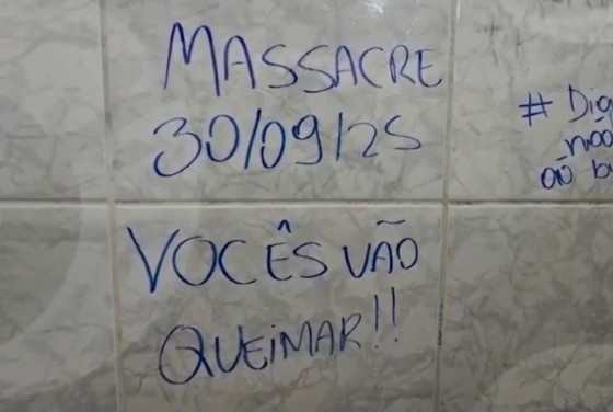 As inscrições foram descobertas por funcionários da limpeza. Entre as frases registradas, estavam “#DigaNãoAoBullying”, “30/09/2025 vocês vão queimar” e “Massacre 30/09 – vai ser igual Suzano”. A referência ao ataque ocorrido em uma escola paulista em 2019 aumentou a preocupação na comunidade escolar.