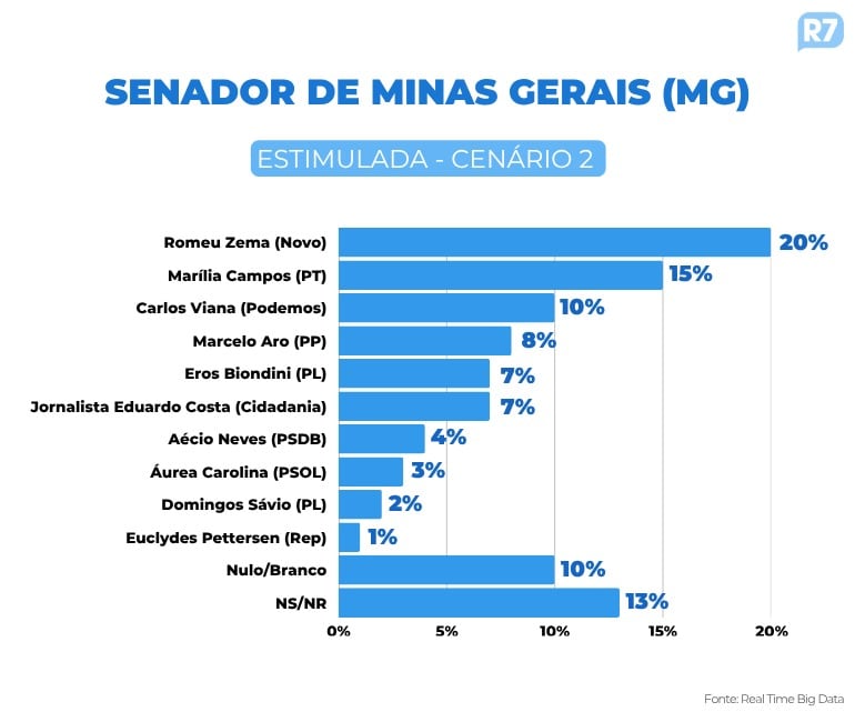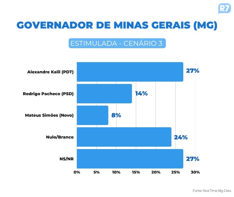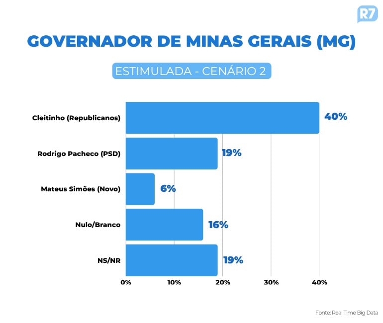 No segundo cenário, Cleitinho também lidera, com 40% dos votos. O ex-presidente do Senado Rodrigo Pacheco (PSD) aparece com 19% das intenções e Simões (Novo) com 6%.