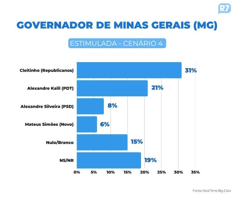 No último cenário, Cleitinho aparece com 31% e Kalil com 21%, seguido de Alexandre Silveira (PSD), com 8%, e Simões, que teve 6%.