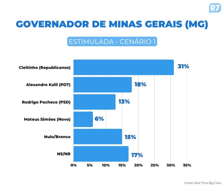 O senador Cleitinho Azevedo (Republicanos) lidera todas as intenções de voto em uma eventual disputa para governador de Minas Gerais, segundo uma pesquisa divulgada pelo Real Time Big Data nesta quarta-feira (8).